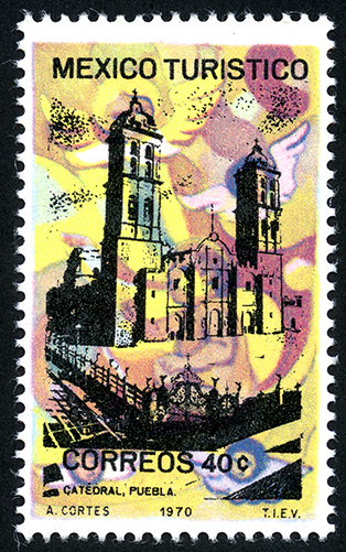 No. Scott: 1011 -- Año de Emisión: 1969-1973 -- Valor facial: Cuarenta Centavos -- Variedad de color: Multicolor -- Perforación: 14 -- Tipo de impresión: Grabado Timbre Postal Mexicano multicolor, en la imagen se observa la fachada de la Catedral del Estado de Puebla, en la parte superior está escrito "MEXICO TURÍSTICO" y en la parte inferior "CORREOS" y el valor facial de "40 C". Para más información favor de dirigirse a biblioteca@mufi.org.mx
