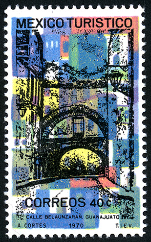 No. Scott: 1012 -- Año de Emisión: 1969-1973 -- Valor facial: Cuarenta Centavos -- Variedad de color: Multicolor -- Perforación: 14 -- Tipo de impresión: Grabado Timbre Postal Mexicano multicolor, en la imagen se observa una calle con casas, al fondo dos arcos y lo que pudiera ser una puerta sobre uno de ellos, en la parte superior está escrito "MEXICO TURÍSTICO" y en la parte inferior "CORREOS , 40 C" y "CALLE BELAUNZARÁN, GUANAJUATO". Para más información favor de dirigirse a biblioteca@mufi.org.mx