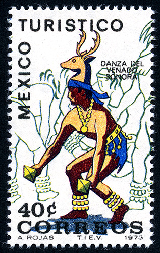 No. Scott: 1013 -- Año de Emisión:1973 -- Valor facial: Cuarenta Centavos -- Variedad de color: Multicolor -- Perforación: 14 -- Tipo de impresión: Grabado Timbre Postal Mexicano multicolor, en la imagen se observa a un danzante representando la Danza del Venado, en la parte de atrás aparecen siluetas de bailarines, en la parte superior está escrito "MEXICO TURÍSTICO", "DANZA DEL VENADO, SONORA" y en la parte inferior "CORREOS" y el valor facial de "40 C". Para más información favor de dirigirse a biblioteca@mufi.org.mx