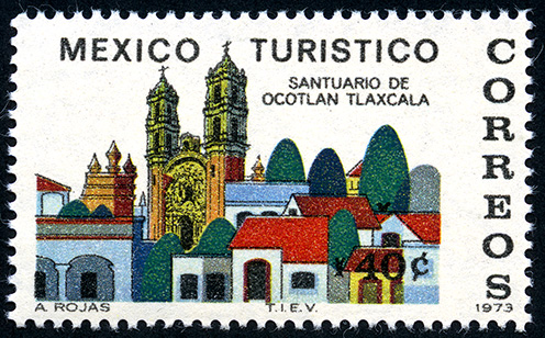 No. Scott: 1014 -- Año de Emisión:1973 -- Valor facial: Cuarenta Centavos -- Variedad de color: Multicolor -- Perforación: 14 -- Tipo de impresión: Grabado TimbrePostal Mexicano multicolor, en la imagen se observa una comunidad con muchas casas, algunos árboles entre las calles y al fondo la fachada de una iglesia, en la parte de arriba aparece escrito "MEXICO TURISTICO, SANTUARIO DE OCOTLÁN TLAXCALA", en la parte lateral derecha "CORREOS" y el valor facial de "40 C". Para más información favor de dirigirse a biblioteca@mufi.org.mx