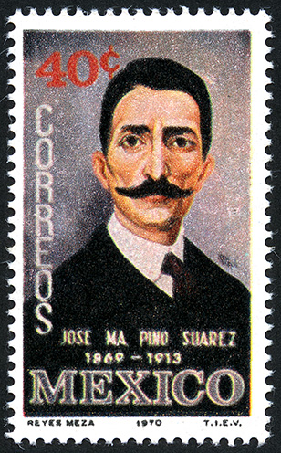 No. Scott: 1028 -- Año de Emisión:1970 -- Valor facial: Cuarenta Centavos -- Variedad de color: Negro, Gris, sepia y Rojo -- Perforación: 14 -- Tipo de impresión: Grabado Timbre Postal Mexicano en colores negro, gris, sepia y rojo, en la imagen se observa la efigie de José María Pino Suárez, en la imagen está escrito el valor facial de "40 C" y "CORREOS MEXICO". Para más información favor de dirigirse a biblioteca@mufi.org.mx