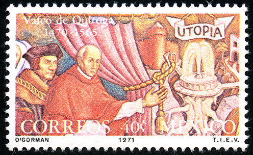No. Scott: 1032 -- Año de Emisión:1971 -- Valor facial: Cuarenta Centavos -- Variedad de color: Multicolor -- Perforación: 14 -- Tipo de impresión: Grabado Timbre Postal Mexicano multicolor, en la imagen aparecen algunas personas, que por su vestimenta son religiosos, en mi opinión están dentro de una iglesia, en la parte superior está escrito"VASCO DE QUIROGA 1470-1565" y en la parte inferior "CORREOS 40 C MEXICO". Para más información favor de dirigirse a biblioteca@mufi.org.mx