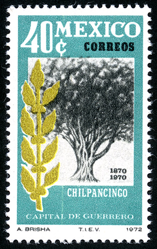 No. Scott: 1042 -- Año de Emisión:1972 -- Valor facial: Cuarenta Centavos -- Variedad de color: Oro, Verde y Negro -- Perforación: 14 -- Tipo de impresión: Grabado Timbre Postal Mexicano en colores oro,verde y negro, al fondo de la imagen se observa un árbol, en la parte frontal una rama en color oro, en la parte superior está escrito eñl valor facial de "40 C", "MEXICO CORREOS" y en la parte inferior "CHILPANCINGO CAPITAL DE GUERRERO". Para más información favor de dirigirse a biblioteca@mufi.org.mx