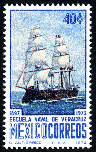 No. Scott: 1041 -- Año de Emisión:1972 -- Valor facial: Cuarenta Centavos -- Variedad de color: Multicolor -- Perforación: 14 -- Tipo de impresión: Grabado Timbre Postal Mexicano multicolor, en la imagen se observa una corbeta de guerra sobre el mar, en la poarte superior, del lado derecho aparece el valor facial de "40 C", en la parte inferior "1897 ESCUELA NAVAL DE VERACRUZ 1972" y "CORREOS MEXICO". Para más información favor de dirigirse a biblioteca@mufi.org.mx