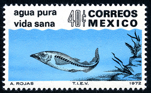 No. Scott: 1049 -- Año de Emisión:1972 -- Valor facial: Cuarenta Centavos -- Variedad de color: Azul y Negro -- Perforación: 14 -- Tipo de impresión: Grabado Timbre Postal Mexicano en colores azul y negro, en la imagen se observa vida acuática, hay un pez y plantas, en la parte superior está escrito "AGUA PURA VIDA SANA", "40 C" y "CORREOS MEXICO2. Para más información favor de dirigirse a biblioteca@mufi.org.mx