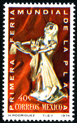 No. Scott: 1060 -- Año de Emisión:1974 -- Valor facial: Cincuenta Centavos -- Variedad de color: Rojo, Blanco, Negro -- Perforación: 14 -- Tipo de impresión: Grabado Timbre Postal Mexicano en colores rojo, blanco y negro, en la imagen se observa una figura elaborada en plata, en el contorno de la misma aparece escrito "PRIMERA FERIA MUNDIAL DE LA PLATA" y en la parte inferior "40 C, CORREOS MEXICO". Para más información favor de dirigirse a biblioteca@mufi.org.mx