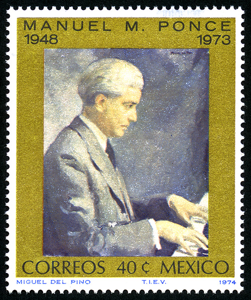 Manuel M. Ponce, al piano -- Con marca de Agua: MEX GRANDE Y ÁGUILA EN CÍRCULO ( XVI ) -- Rotograbado -- Con Perforación -- Cuarenta Centavos -- Oro, Gris, Azul, Negro