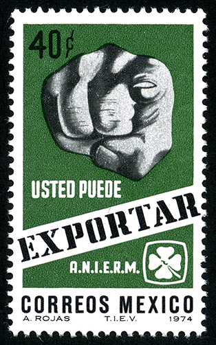 No. Scott: 1057 -- Año de Emisión: 1974 -- Valor facial: Cuarenta Centavos -- Variedad de color: Verde y Negro -- Perforación: 14 -- Tipo de impresión: Grabado Timbre Postal Mexicano en colores verde y negro, arriba de la imagen se observa una mano apuntando al frente con el dedo índice, en medio la frase "USTED PUEDE EXPORTAR A.N.I.E.R.M." y un trebol en color blanco, en la parte superior aparece escrito el valor facial de "40 C" y en el interior "CORREOS MEXICO". Para más información favor de dirigirse a biblioteca@mufi.org.mx