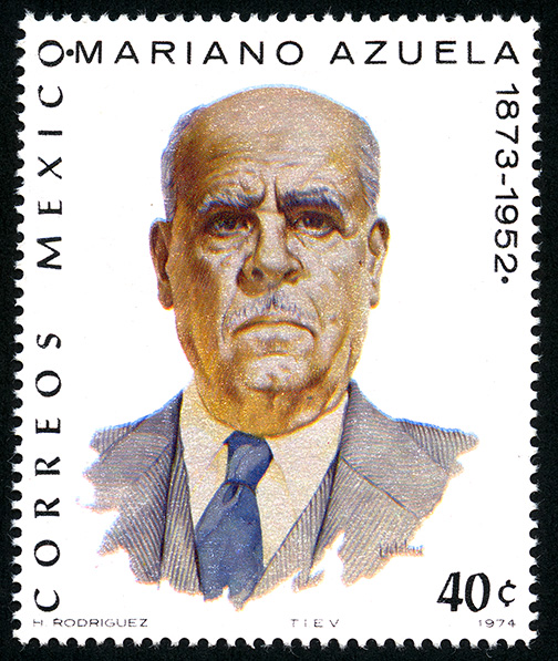 Dr. Mariano Azuela. -- Con marca de Agua: MEX-MEX Y ÁGUILA EN CÍRCULO (XVI) -- Huecograbado -- Con Perforación -- Cuarenta Centavos -- Gris, Azul, Amarillo, Café