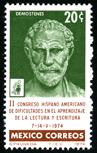 No. Scott: 1066 -- Año de Emisión: 1974 -- Valor facial: Veinte Centavos -- Variedad de color: Verde y Café -- Perforación: 14 -- Tipo de impresión: Grabado Timbre Postal Mexicano en colores verde y café, en la imagen se observa la efigie de Demóstenes, orador y político griego, en la parte superior aparece el valor facial de "20 C", en la parte inferior "II CONGRESO HISPANO AMERICANO DE DIFICULTADES EN EL APRENDIZAJE DE LA LECTURA Y ESCRITURA" y "CORREOS MEXICO". Para más información favor de dirigirse a biblioteca@mufi.org.mx