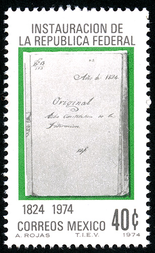 No. Scott: 1068 -- Año de Emisión: 1974 -- Valor facial: Cuarenta Centavos -- Variedad de color: Gris y Verde -- Perforación: 14 -- Tipo de impresión: Grabado Timbre Postal Mexicano en colores gris y verde, en la imagen se observa la portada de un documento antiguo que tiene impreso "Año de 1824, Original, Acta Constitutiva de la Federación", en la parte superior aparece escrito "INSTAURACION DE LA REPUBLICA FEDERAL", en la parte inferior "1824-1974", "CORREOS MEXICO" y el valor facial de "40 C". Para más información favor de dirigirse a biblioteca@mufi.org.mx