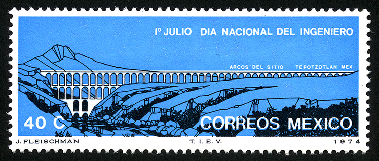 No. Scott: 1063 -- Año de Emisión: 1974 -- Valor facial: Cuarenta Centavos -- Variedad de color: Azul y Negro -- Perforación: 14 -- Tipo de impresión: Grabado Timbre Postal Mexicano en colores azul y negro, en la imagen se observan los Arcos del Sitio, cuya obra monumental se encuentra en Tepotzotlán, México, en la parte superior está escrito "1o. DE JULIO DIA NACIONAL DEL INGENIERO", en la parte inferior el valor facial de "40 C" y "CORREOS MEXICO". Para más información favor de dirigirse a biblioteca@mufi.org.mx