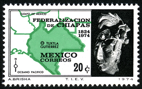 No. Scott: 1067 -- Año de Emisión: 1974 -- Valor facial: Veinte Centavos -- Variedad de color: Negro y Verde -- Perforación: 14 -- Tipo de impresión: Grabado Timbre Postal Mexicano en colores negro y verde, en la imagen se observa el mapa del estado de Tabasco, así como una cabeza prehispánica, sobre el mapa está escrito "FEDERACIÓN DE CHIAPAS 1824-1974", "MEXICO CORREOS" y el valor facial de "20 C". Para más información favor de dirigirse a biblioteca@mufi.org.mx
