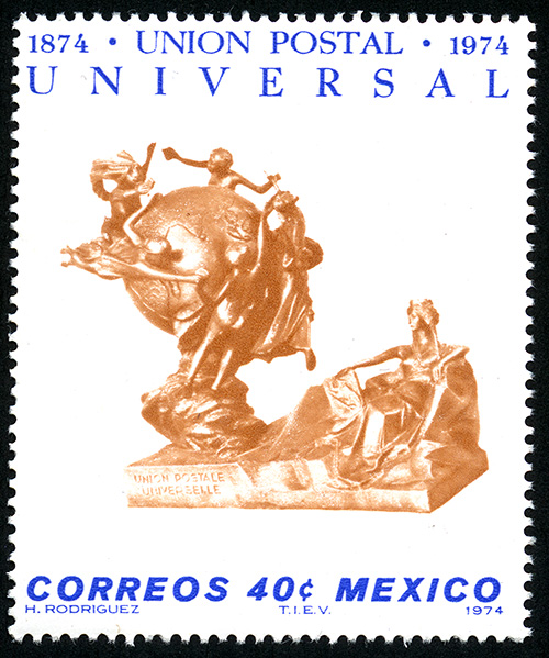 Monumento a la UPU en la Ciudad de Berna, Suiza -- Con marca de Agua: MEX-MEX Y ÁGUILA EN CÍRCULO ABIERTO (XVI) -- Huecograbado -- Con Perforación -- Cuarenta Centavos -- Azul, Café Claro