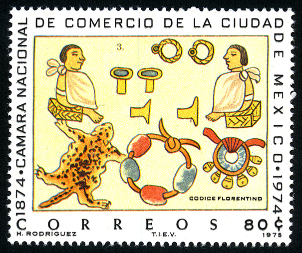 No. Scott: 1085 -- Año de Emisión: 1975 -- Valor facial: Ochenta Centavos -- Variedad de color: Multicolor -- Perforación: 14 -- Tipo de impresión: Grabado Timbre Postal Mexicano multicolor, en la imagen se observa la portada de un Códice Florentino, el cual contiene diferentes imágenes prehispánicas, sobre el contorno esta escrito "CAMARA NACIONAL DE COMERCIO DE LA CIUDAD DE MEXICO 1874-1974", en la parte inferior "CORREOS" y el valpor facial de "80 C". Para más información favor de dirigirse a biblioteca@mufi.org.mx