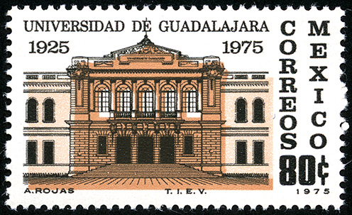 No. Scott: 1107 -- Año de Emisión: 1975 -- Valor facial: Ochenta Centavos -- Variedad de color: Café Claro, Negro y Rosa -- Perforación: 14 -- Tipo de impresión: Grabado Timbre Postal Mexicano en colores café claro, negro y rosa, en la imagen se observa la fachada del antiguo edificio de la Universidad de Guadalajara fundada en 1925, en el lado lateral derecho está escrito "CORREOS MEXICO" y el valor facial de "80 C". Para más información favor de dirigirse a biblioteca@mufi.org.mx