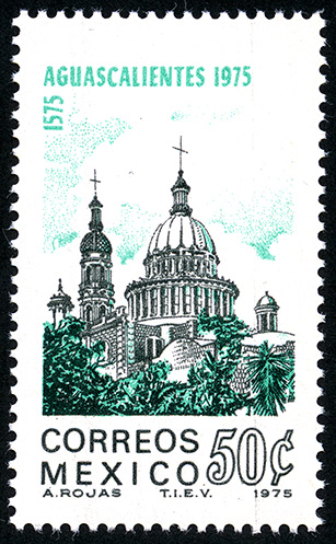 No. Scott: 1140 -- Año de Emisión: 1975 -- Valor facial: Cincuenta Centavos -- Variedad de color: Verde y Negro -- Perforación: 14 -- Tipo de impresión: Grabado Timbre Postal Mexicano en colores verde y negro, en la imagen se observa un edificio católico y vegetación en la parte frontal, en la parte superior está escrito "AGUASCALIENTES 1575-1975", en la parte inferior "CORREOS MEXICO" y el valor facial de "50 C". Para más información favor de dirigirse a biblioteca@mufi.org.mx