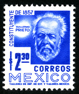 No. Scott: 1075 -- Año de Emisión: 1975 -- Valor facial: Dos Pesos con Treinta Centavos -- Variedad de color: Ultramarino -- Perforación: 14 -- Tipo de impresión: Grabado Timbre Postal Mexicano en color ultramarino, en la imagen se observa la efigie de Guillerno Prieto, en la parte superior izquierda, está escrito "CONSTITUYENTE DE 1857", en la parte inferior "CORREOS MEXICO" y el valor facial de "2.30 ESOS". Para más información favor de dirigirse a biblioteca@mufi.org.mx