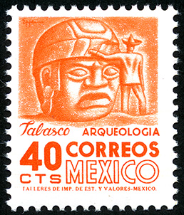 No. Scott: 1090 -- Año de Emisión: 1975 -- Valor facial: Cuarenta Centavos -- Variedad de color: Bermellón -- Perforación: 14 -- Tipo de impresión: Grabado Timbre Postal Mexicano en color bermellón,en la imagen se observa una Cabeza Colosal, misma que se encuentra en el estado de Tabasco y pertenece a la cultura Olmeca, en la parte inferior está escrito "TABASCO", "ARQUEOLOGÍA", "CORREOS MEXICO" y el valor facial de "40 CTS". Para más información favor de dirigirse a biblioteca@mufi.org.mx