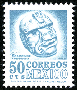 No. Scott: 1091 -- Año de Emisión: 1975 -- Valor facial: Cincuenta Centavos -- Variedad de color: Azul Turquesa -- Perforación: 14 -- Tipo de impresión: Grabado Timbre Postal Mexicano en color azul turqueza,en la imagen se observa una Cabeza Colosal Tres Zapotes, misma que se encuentra en el estado de Veracruz y pertenece a la cultura Olmeca, en la parte inferior está escrito "VERACRUZ", "ARQUEOLOGÍA", "CORREOS MEXICO" y el valor facial de "50 CTS". Para más información favor de dirigirse a biblioteca@mufi.org.mx