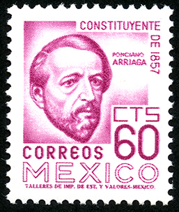 No. Scott: 1092 -- Año de Emisión: 1975 -- Valor facial: Sesenta Centavos -- Variedad de color: Rosa Oscuro -- Perforación: 14 -- Tipo de impresión: Grabado Timbre Postal Mexicano en color rosa oscuro, en la imagen se observa la efigie de Ponciano Arriaga, en la parte superior del lado derecho, está escrito "CONSTITUYENTE DE 1857", en la parte inferior "CORREOS MEXICO" y el valor facial de "60 C". Para más información favor de dirigirse a biblioteca@mufi.org.mx