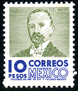 No. Scott: 1101 -- Año de Emisión: 1975 -- Valor facial: Diez Pesos -- Variedad de color: Verde, Gris y Ultramarino -- Perforación: 14 -- Tipo de impresión: Grabado Timbre Postal Mexicano en colores verde, gris y ultramarino, en la imagen ae observa la efigie de Francisco Ignacio Madero, en la parte inferior está escrito "CORREOS MEXICO" y el valor facial de "10 PESOS ". Para más información favor de dirigirse a biblioteca@mufi.org.mx
