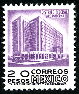 No. Scott: 1102 -- Año de Emisión: 1975 -- Valor facial: Veinte Pesos -- Variedad de color: Violeta y Negro -- Perforación: 14 -- Tipo de impresión: Grabado Timbre Postal Mexicano en colores violeta y negro, en la imagen se observa un edificio moderno, el cual se ubica en el Estado de México, D.F., en la parte inferior aparece escrito "CORREOS MEXICO" y el valor facial de "20 PESOS". Para más información favor de dirigirse a biblioteca@mufi.org.mx