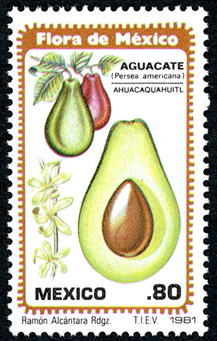 No. Scott: 1235 -- Año de Emisión: 1981 -- Valor facial: Ochenta Centavos -- Variedad de color: Multicolor -- Perforación: 14 -- Tipo de impresión: Grabado Timbre Postal Mexicano multicolor, al fondo de la imagen se observan dos aguacates colgados de sus ramas en colores diferentes, en la parte frontal aparece la mitad de este fruto y de lado izquierdo la flor del mismo, en la parte superior está escrito "FLORA DE MÉXICO", "AGUACATE (PERSEA AMERICANA) AHUACAQÚAHUITL", en la parte inferior "MEXICO" y el valor facial de ".80 C". Para más información favor de dirigirse a biblioteca@mufi.org.mx