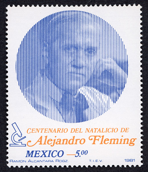 No. Scott: 1241 -- Año de Emisión: 1981 -- Valor facial: Cinco Pesos -- Variedad de color: Azul y Amarillo Oro -- Perforación: 14 -- Tipo de impresión: Grabado Timbre Postal Mexicano en colores azul y amarillo oro, en la imagen se observa el retrato del científico escocés Alejandro Fleming, conocido principalmente por el descubrimiento de la penicilina y la lisozima, en la parte inferior aparece escrito "CENTENARIO DEL NATALICIO DE ALEJANDRO FLEMING", "MEXICO" y el calor facial de "5.00". Para más información favor de dirigirse a biblioteca@mufi.org.mx