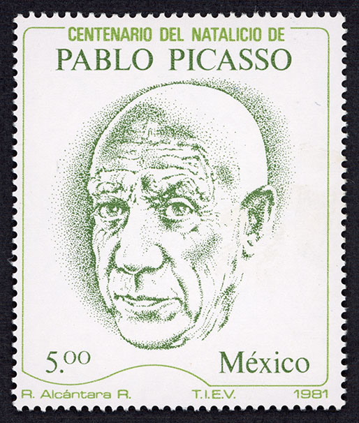 No. Scott: 1251 -- Año de Emisión: 1981 -- Valor facial: Cinco Pesos -- Variedad de color: Verde Claro y Verde -- Perforación: 14 -- Tipo de impresión: Grabado Timbre Postal Mexicano en colores verde claro y verde, en la imagen se observa el rostro del pintor español Pablo Picasso, en la parte superior aparece escrito "CENTENARIO DEL NATALICIO DE PLABLO PICASSO", en la parte inferior el valor facial de "5.00" y "MEXICO". Para más información favor de dirigirse a biblioteca@mufi.org.mx