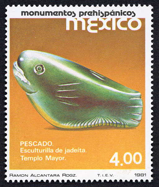 No. Scott: 1250 -- Año de Emisión: 1981 -- Valor facial: Cuatro Pesos -- Variedad de color: Amarillo, Verde, Café y Negro -- Perforación: 14 -- Tipo de impresión: Grabado Timbre Postal Mexicano en colores amarillo, verde, café y negro, en la imagen se observa una pieza prehispánica en forma de pez, en mi opinión esta elaborada en piedra de jade, en la parte superior está escrito "Monumentos Prehispánicos", "MEXICO" y en la parte inferior en valor facial de "4.00". Para más información favor de dirigirse a biblioteca@mufi.org.mx
