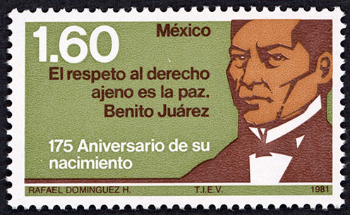 No. Scott: 1229 -- Año de Emisión: 1981 -- Valor facial: Un Peso con Sesenta Centavos -- Variedad de color: Verde, Café Rojizo y Negro -- Perforación: 14 -- Tipo de impresión: Grabado Timbre Postal Mexicano en colores verde, café rojizo y negro, en la imagen se observa un retrato del Lic. Benito Juárez Benemérito de las Américas, en la parte superior aparece escrito el valor facial de "1.60" y "MEXICO", en la parte central "EL RESPETO AL DERECHO AJENO ES LA PAZ. BENITO JUÁREZ" y al final "175 ANIVERSARIO DE SU NACIMIENTO". Para más información favor de dirigirse a biblioteca@mufi.org.mx