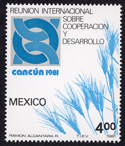 No. Scott: 1256 -- Año de Emisión: 1981 -- Valor facial: Cuatro Pesos -- Variedad de color: Azul, Gris y Negro -- Perforación: 14 -- Tipo de impresión: Grabado Timbre Postal Mexicano en colores azul, gris y negro, en la parte superior lado izquierdo, se observa el emblema de la REUNION INTERNACIONAL SOBRE COOPERACION Y DESARROLLO, CANCÚN 1981", en la parte inferior del lado derecho numerosas espigas de trigo, así también está escrito "MEXICO" y el valor facial de "4.00". Para más información favor de dirigirse a biblioteca@mufi.org.mx