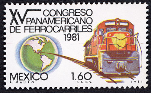 No. Scott: 1257 -- Año de Emisión: 1981 -- Valor facial: Un Peso con Sesenta Centavos -- Variedad de color: Multicolor -- Perforación: 14 -- Tipo de impresión: Grabado Timbre Postal Mexicano multicolor, del lado izquierdo de la imagen se observa un mapa del continente americano, del lado derecho una locomotora sobre una línea de ferrocarril, en la parte superior está escrito "XV CONGRESO PANAMERICANO DE FERROCARRILES 1981", en la parte inferior "MEXICO" y el valor facial de "1.60". Para más información favor de dirigirse a biblioteca@mufi.org.mx