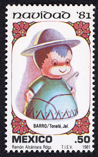 No. Scott: 1252 -- Año de Emisión: 1981 -- Valor facial: Cincuenta Centavos -- Variedad de color: Multicolor -- Perforación: 14 -- Tipo de impresión: Grabado Timbre Postal Mexicano multicolor, en la imagen se observa a un niño de juguete, elaborado en barro y centrado en un margen ornamentado, en la parte superior está escrito "Navidad 81", en la parte inferior "MEXICO" y el valor facial de ".50". Para más información favor de dirigirse a biblioteca@mufi.org.mx