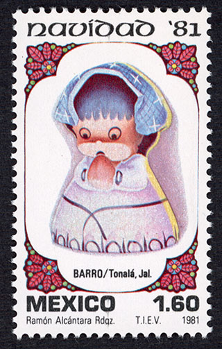 No. Scott: 1253 -- Año de Emisión: 1981 -- Valor facial: Un Peso con Sesenta Centavos -- Variedad de color: Multicolor -- Perforación: 14 -- Tipo de impresión: Grabado Timbre Postal Mexicano multicolor, en la imagen se observa a una niña de juguete, elaborada en barro y centrada en un margen ornamentado, en la parte superior está escrito "Navidad 81", en la parte inferior "MEXICO" y el valor facial de ".50". Para más información favor de dirigirse a biblioteca@mufi.org.mx