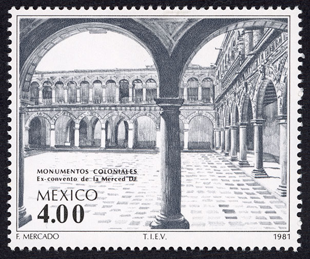 No. Scott: 1261 -- Año de Emisión: 1981 -- Valor facial: Cuatro Pesos -- Variedad de color: Gris, Negro -- Perforación: 14 -- Tipo de impresión: Grabado Timbre Postal Mexicano en colores gris y negro, en la imagen se observa el Ex Convento de La Merced, edificio colonial, perteneciente al estado de México, en la parte inferior está escrito "MONUMENTOS COLONIALES", "EX CONVENTO DE LA MERCED D.F.", "MEXICO" y el valor facial de "4.00". Para más información favor de dirigirse a biblioteca@mufi.org.mx