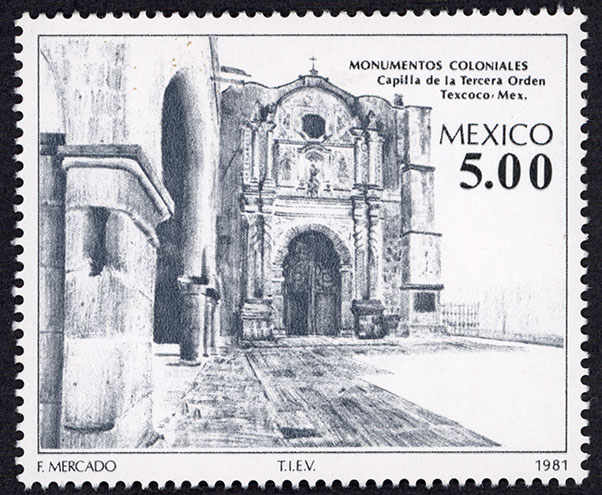No. Scott: 1262 -- Año de Emisión: 1981 -- Valor facial: Cinco Pesos -- Variedad de color: Gris, Negro -- Perforación: 14 -- Tipo de impresión: Grabado Timbre Postal Mexicano en colores gris y negro, en la imagen se observa La Capilla de la Tercera Orden, edificio colonial perteneciente al estado de México, en la parte superior del lado derecho está escrito "MONUMENTOS COLONIALES", "CAPILLA DE LA TERCERA ORDEN", "TEXCOCO", "MEXICO" y el valor facial de "5.00". Para más información favor de dirigirse a biblioteca@mufi.org.mx