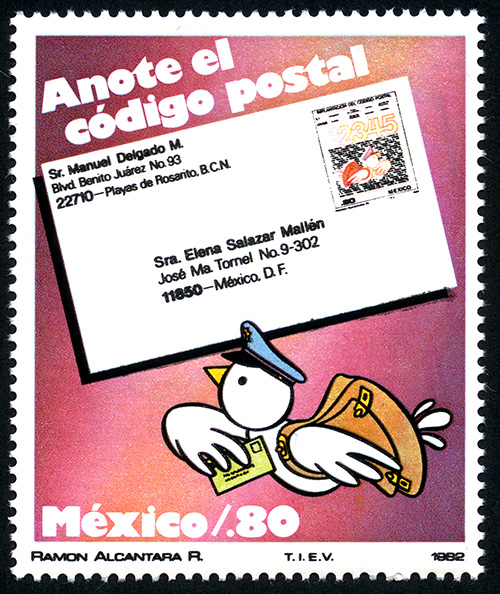 No. Scott: 1270 -- Año de Emisión: 1982 -- Valor facial: Ochenta Centavos -- Variedad de color: Multicolor -- Perforación: 14 -- Tipo de impresión: Grabado Timbre Postal Mexicano multicolor, en la imagen se observa un sobre rotulado y un palomo cartero en posición de vuelo, lleva en la cabeza una gorra de plato, colgada de una ala una bosa de cartero y en la otra ala un obre, sujeta al pecho, en la parte superior está escrito "ANOTE EL CODIGO POSTAL", en la parte inferior "MEXICO" y el valor facial de ".80". Para más información favor de dirigirse a biblioteca@mufi.org.mx