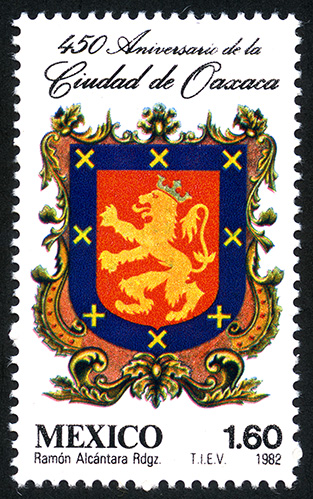 No. Scott: 1273 -- Año de Emisión: 1982 -- Valor facial: Un Peso con Sesenta Centavos -- Variedad de color: Multicolor -- Perforación: 14 -- Tipo de impresión: Grabado Timbre Postal Mexicano multicolor, en la imagen se observa el Escudo de la Ciudad de Oaxaca, en la parte superior está escrito "450 ANIVERSARIO DE LA CIUDAD DE OAXACA", "MEXICO" y el valor facial de "1.60". Para más información favor de dirigirse a biblioteca@mufi.org.mx