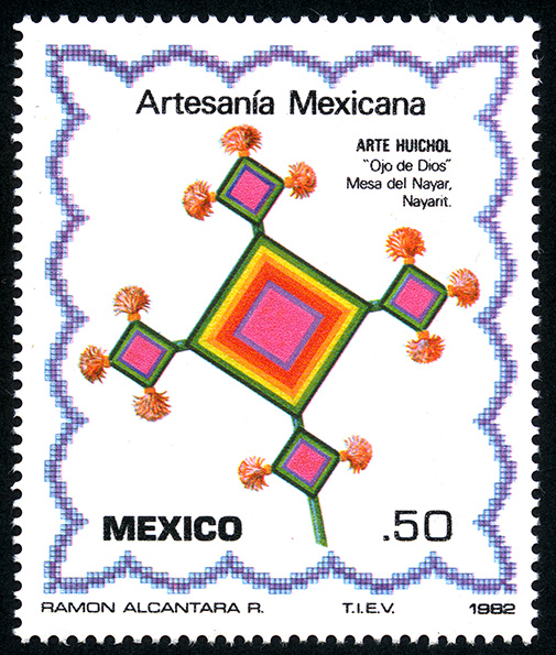 No. Scott: 1267 -- Año de Emisión: 1982 -- Valor facial: Cincuenta Centavos -- Variedad de color: Multicolor -- Perforación: 14 -- Tipo de impresión: Grabado Timbre Postal Mexicano multicolor, en la imagen se observa un objeto tejido en hilo sobre una cruz de madera, elaborada en diferentes colores, en la parte superior está escrito "Artesanía Mexicana", "ARTE HUICHOL", "Ojo de Dios", en la parte inferior la palabre "MEXICO" y el valor facial de ".50 C". Para más información favor de dirigirse a biblioteca@mufi.org.mx