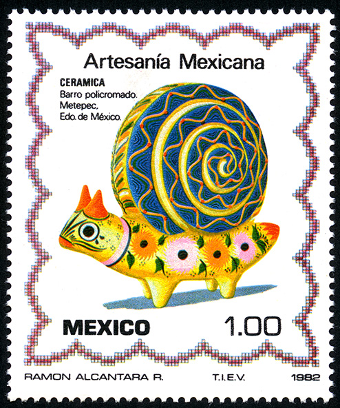 No. Scott: 1268 -- Año de Emisión: 1982 -- Valor facial: Un Peso -- Variedad de color: Multicolor -- Perforación: 14 -- Tipo de impresión: Grabado Timbre Postal Mexicano multicolor, en la imagen se observa un caracol elaborado en barro policromado, en el cual resalta una gran variedad de figuras, formas y colores, en la parte superior está escrito "Artesanía Mexicana", "Cerámica", Barro Policromado", en la parte inferior la palabra "MEXICO2 y el valor facial de "1.00". Para más información favor de dirigirse a biblioteca@mufi.org.mx