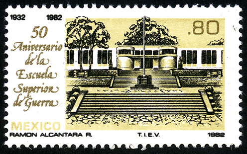 No. Scott: 1272 -- Año de Emisión: 1982 -- Valor facial: Ochenta Centavos -- Variedad de color: Beige, Negro y Dorado -- Perforación: 14 -- Tipo de impresión: Grabado Timbre Postal mexicano en colores beige, negro y dorado, en la imagen se observa el edificio de la Escuela Superior de Guerra, la palabra "MEXICO" y el valor facial de ".80". Para más información favor de dirigirse a biblioteca@mufi.org.mx