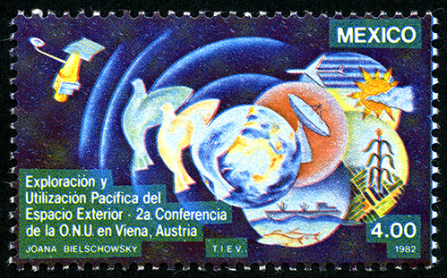 No. Scott: 1284 -- Año de Emisión: 1982 -- Valor facial: Cuatro Pesos -- Variedad de color: Multicolor -- Perforación: 14 -- Tipo de impresión: GrabadoTimbre Postal Mexicano multicolor, en la imagen representa una parte del espacio ultraterrestre, en donde podemos observar cuerpos celestes, satélites, mundo marino y agrícola, un avión, una antena parabólica y tres palomas en vuelo, en la parte superior está escrito "MEXICO", en la parte inferior "Exploración y Utilización Pacífica del Espacio Exterior. 2a. Conferencia de la O.N.U. en Viena Australia y el valor facial de "4.00".