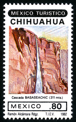 No. Scott: 1274 -- Año de Emisión: 1982 -- Valor facial: Ochenta Centavos -- Variedad de color: Multicolor -- Perforación: 14 -- Tipo de impresión: Grabado Timbre Postal Mexicano multicolor, en la imagen se observa una cascada de agua, que cae de formaciones rocosas, en la parte superior está escrito MEXICO TURISTICO", "CHIHUAHUA", en la parte inferior "MEXICO" y el valor facial de ".80". Para más información favor de dirigirse a biblioteca@mufi.org.mx