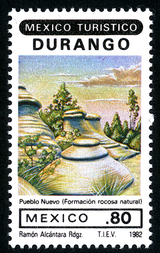 No. Scott: 1275 -- Año de Emisión: 1982 -- Valor facial: Ochenta Centavos -- Variedad de color: Multicolor -- Perforación: 14 -- Tipo de impresión: Grabado Timbre Postal Mexicano multicolor, al fondo de la imagen se observan nubes y una parte de vegetación, en primer plano aparecen formaciones rocosas prismáticas y con acabados en curva, en la parte superior está escrito "MEXICO TURISTICO", "DURANGO", en la parte inferior "MEXICO" y el valor facial de ".80". Para más información favor de dirigirse a biblioteca@mufi.org.mx