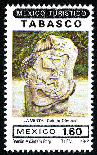 No. Scott: 1277 -- Año de Emisión: 1982 -- Valor facial: Un Peso con Sesenta Centavos -- Variedad de color: Multicolor -- Perforación: 14 -- Tipo de impresión: Grabado Timbre Postal Mexicano multicolor, en la parte frontal de la imagen aparece un monumento prehispánico elaborado en piedra y de una sola pieza sin forma definida, al fondo observamos una área verde, espesa y frondosa, en la parte superior está escrito "MEXICO TURISTICO" , "TABASCO", en la parte inferior "MEXICO" y el valor facial de "1.60". Para más información favor de dirigirse a biblioteca@mufi.org.mx