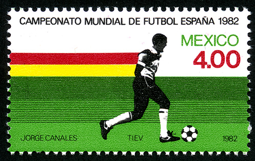 No. Scott: 1279 -- Año de Emisión: 1982 -- Valor facial: Cuatro Pesos -- Variedad de color: Verde, Rojo, Amarillo y Negro -- Perforación: 14 -- Tipo de impresión: Grabado Timbre Postal Mexicano en colores verde, rojo, amarillo y Negro, la imagen nos representa a un jugador de futbol soccer relizando una jugada sobre una área verde, atrás se observan los colores de la bandera de España, en la parte superior está escrito "CAMPEONATO MUNDIAL DE FUTBOL ESPAÑA 1982", "MEXICO" y el valor facial de "4.00". Para más información favor de dirigirse a biblioteca@mufi.org.mx