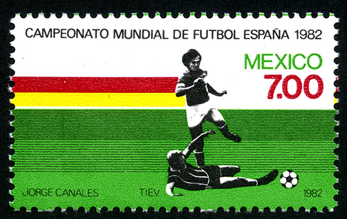 No. Scott: 1280 -- Año de Emisión: 1982 -- Valor facial: Siete Pesos -- Variedad de color: Verde, Rojo, Amarillo y Negro -- Perforación: 14 -- Tipo de impresión: Grabado Timbre Postal Mexicano en colores verde, rojo, amarillo y negro, la imagen nos representa a dos jugadores de futbol soccer relizando una jugada sobre una área verde, atrás se observan los colores de la bandera de España, en la parte superior está escrito "CAMPEONATO MUNDIAL DE FUTBOL ESPAÑA 1982", "MEXICO" y el valor facial de "7.00". Para más información favor de dirigirse a biblioteca@mufi.org.mx