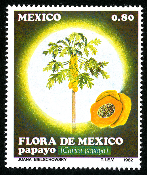No. Scott: 1288 -- Año de Emisión: 1982 -- Valor facial: Ochenta Centavos -- Variedad de color: Multicolor -- Perforación: 14x14 1/2 -- Tipo de impresión: Grabado Timbre Postal Mexicano multicolor, en la imagen se observa un árbol de papaya con muchos frutos, el cual se encuentra dentro de un círculo luminoso, rodeado de colores amarillo y verde, en la parte superior está escrito "MEXICO", el valor facial de ".80 C", en la parte inferior "FLORA DE MEXICO", "papayo" /carica papaya/. Para más información favor de dirigirse a biblioteca@mufi.org.mx